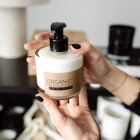 Juniper organic hand lotion in glass bottle